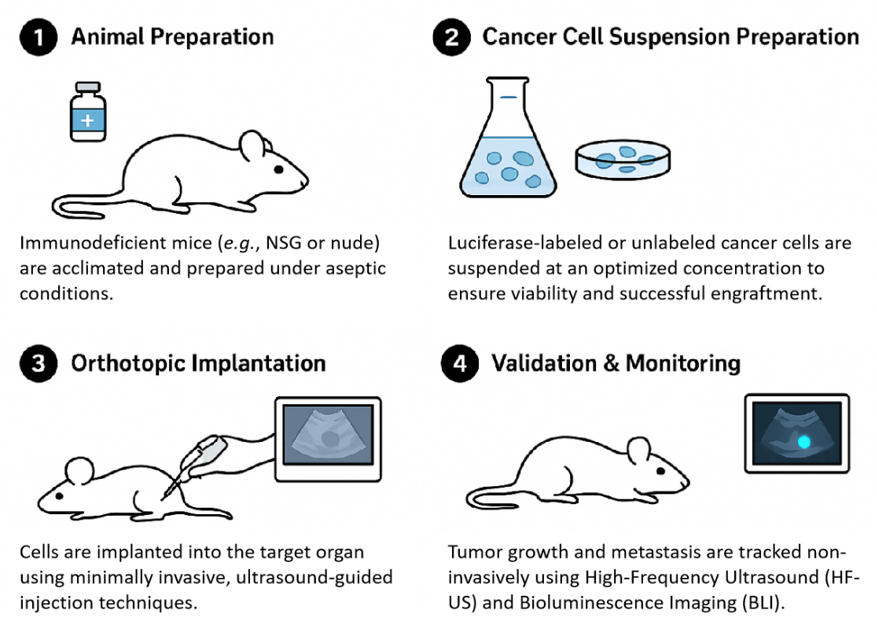 Orthotopic tumor models (also known as in situ models) are created by injecting tumor cells/tissue fragments into the organ of origin. Unlike subcutaneous xenografts, orthotopically implanted tumors grow within the organ microenvironment, reconstituting more realistic stromal, vascular and immune interactions.